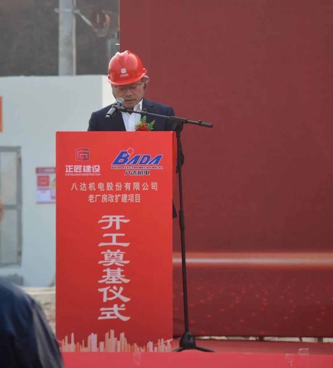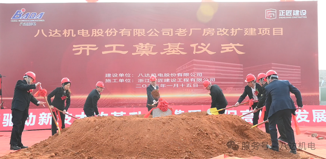 2025年1月15日,八達機電股份有限公司老廠房改擴建項目開工奠基儀式在施工地隆重舉行。八達機電股份有限公司董事長兼總經理杜左海與其他董事、高管及多位股東、員工代表,施工單位浙江正匠建設工程有限公司董事長蔡冷雙等出席儀式。