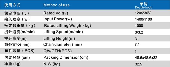 采用吊鉤懸掛式或吊環懸掛式安裝采用機械制動和上下行程開關控制;采用高強度起重環鏈使用壽命更長采用110V、230V單相電源。